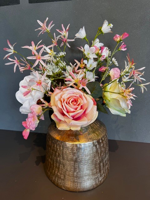 Dit boeket is zorgvuldig samengesteld om jouw ruimte de juiste sfeer te geven. Met behulp van de flexibele ijzerdraadjes in elk bloemblaadje en takje kun je moeiteloos de gewenste stijl creëren.