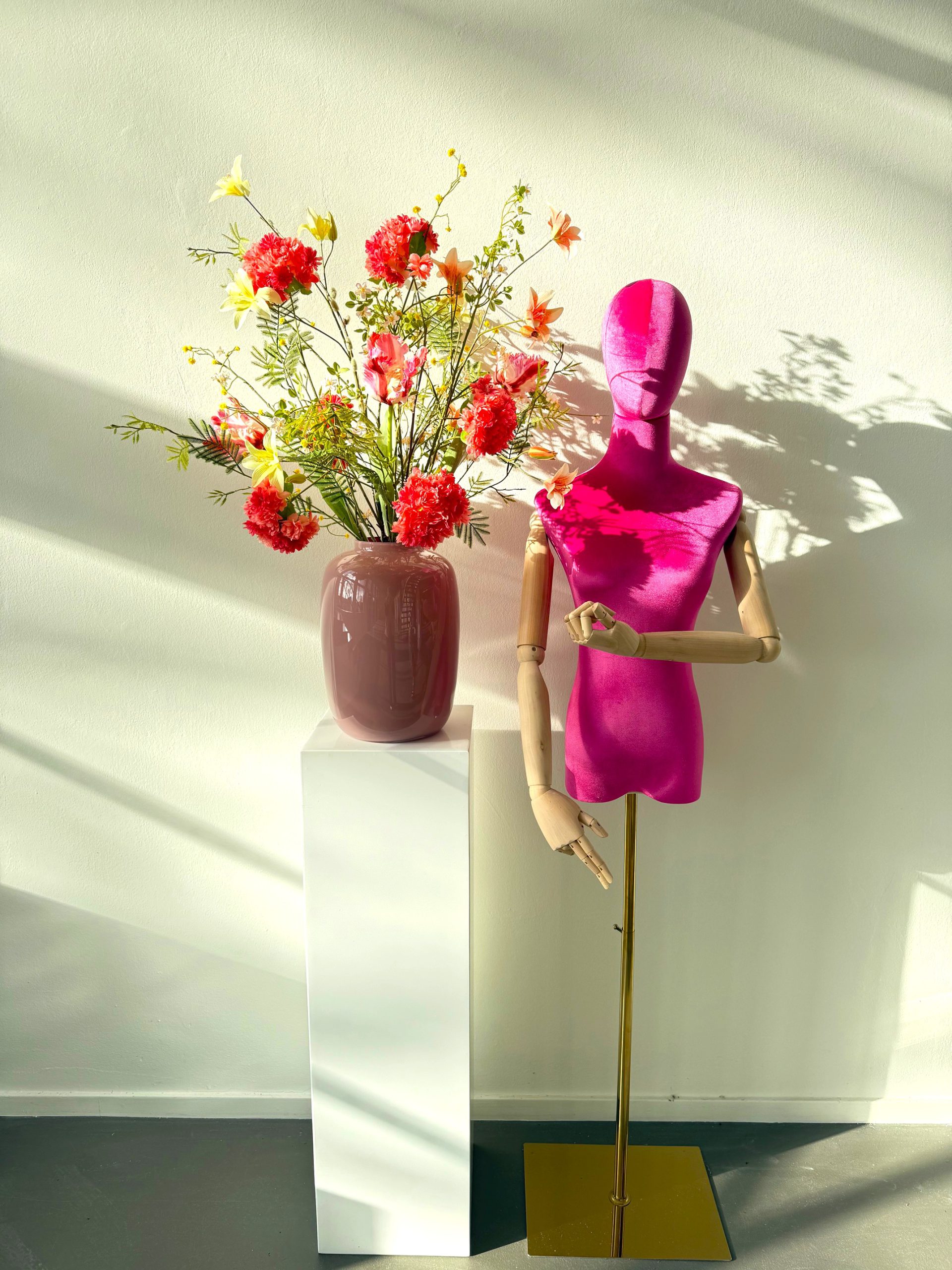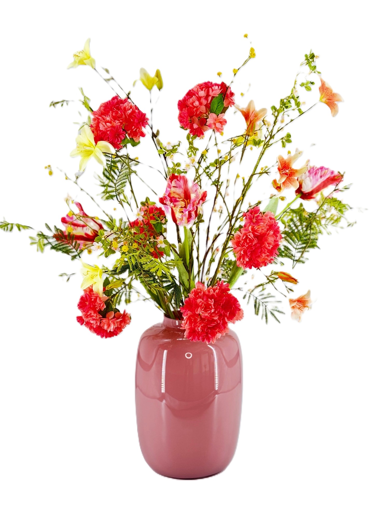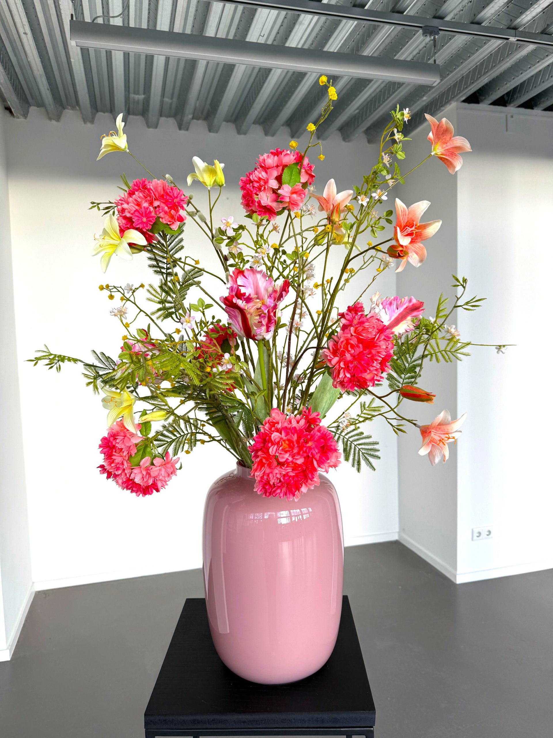 Dit boeket is zonder de vaas, wil je deze erbij bestellen, dan is dit een vaas van 35 cm hoog.